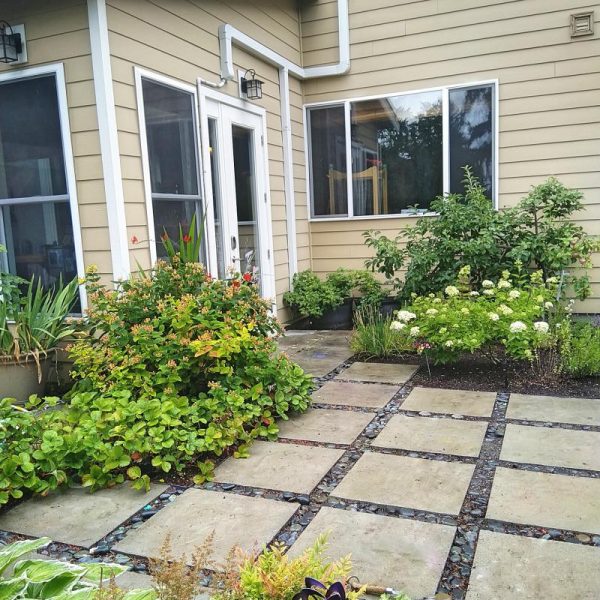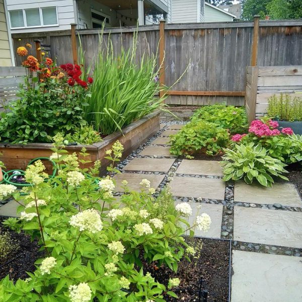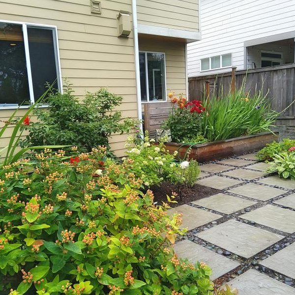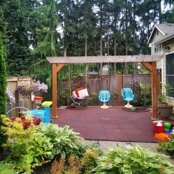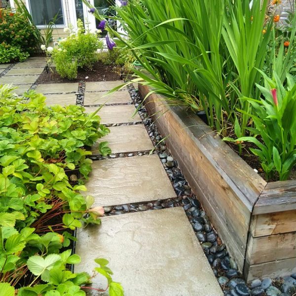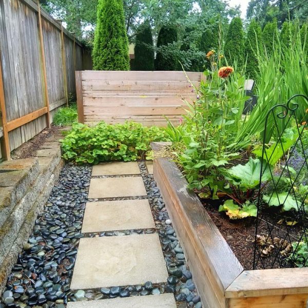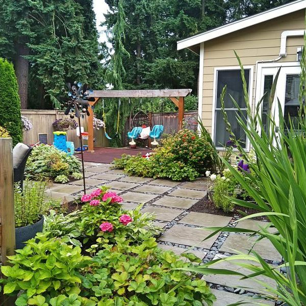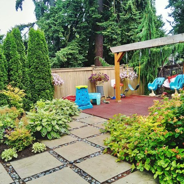 We created a new landscape for them, where adults are relaxing in the lounge area while kids play with bubbles, draw with chalk and take turns on the swing. Herbs and veggies are harvested for cooking while kids forage for strawberries, blueberries and raspberries. Paths connect these various outdoor rooms and the planting beds serve as living partitions to these rooms.